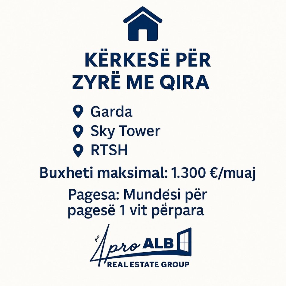 Sipërfaqja: Sipas ofertës – preferohen ambiente të përshtatshme për zyrë Tipi i ambientit: Zyrë biznesi, e gatshme për përdorim. Afati i marrjes: E disponueshme menjëherë ose në një afat të shkurtër.
