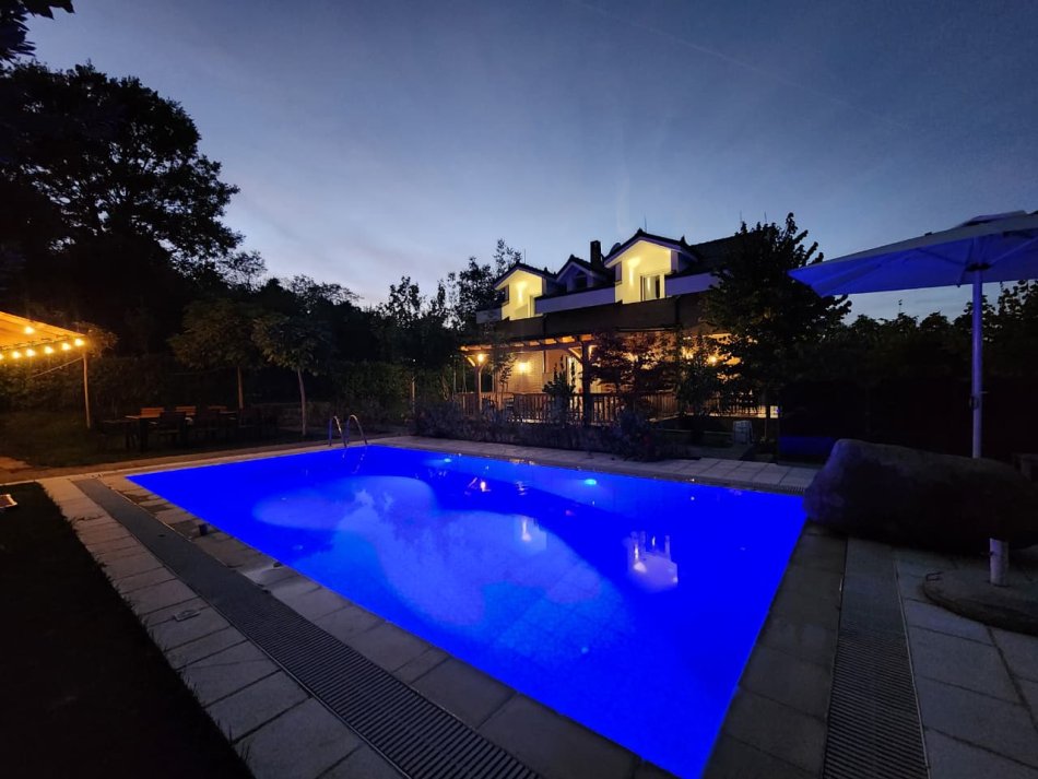 - Pishina BLU KRISTAL 🔵 është me dhomë teknike 8x4 m dhe 2 m e thellë me sistem dritash me 6 ngjyra