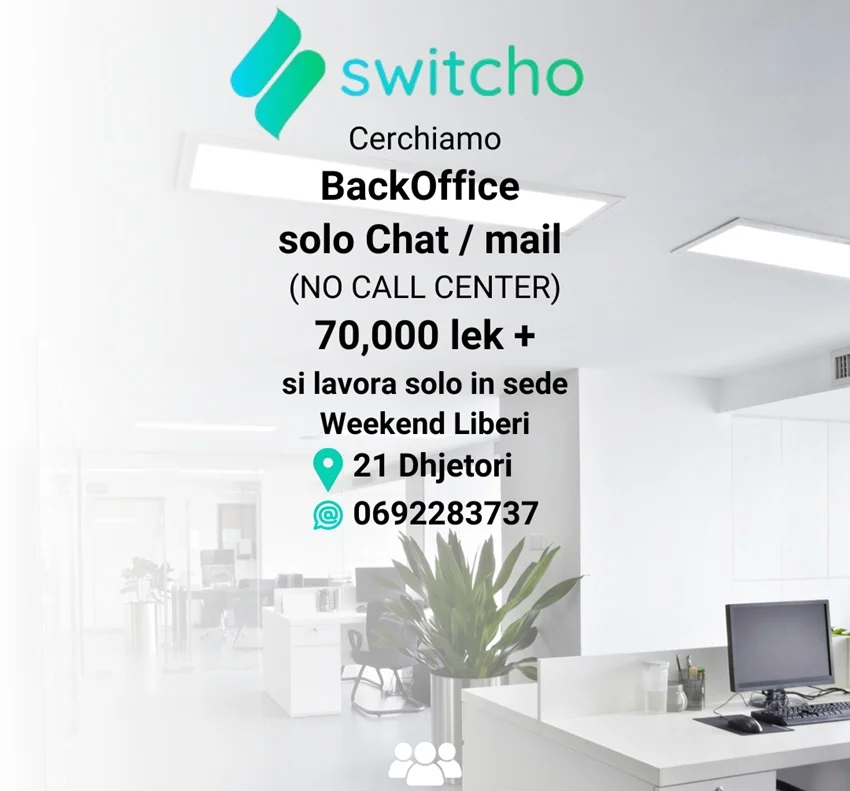 Chi siamo: Switcho, parte del gruppo rinomato SOS Tariffe, è un comparatore digitale che supporta i clienti italiani nel risparmio su utenze come luce, gas, internet, mobile, RCA, assicurazioni per animali e casa. Siamo alla ricerca di nuovi talenti da inserire nel nostro team per la sede di Tirana.
