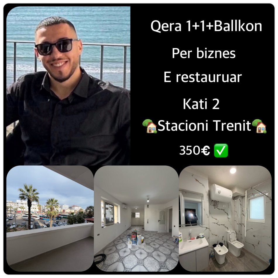 Jepet me qera apartament 1+1 me ballkon, i pozicionuar prane stacionit te trenit ne Durres, zone shume e pershtatshme per zhvillim aktiviteti. Ambienti eshte totalisht i rinovuar eshte ne faze punimi, shume shpejt gati per perdorim. Jepet per biznes dhe eshte i pershtatur per profesione te lira si zyre avokatie, arkitekture, kontabiliteti, agjenci sherbimesh apo konsulence. Qeraja eshte 350€ neto ne muaj dhe jepet vetem per afatgjate.