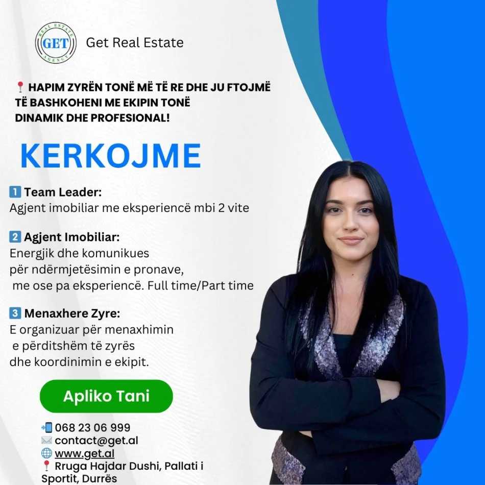 2️⃣ Agjent Imobiliar: Energjik dhe komunikues për ndërmjetësimin e pronave, me ose pa eksperiencë. Full time/Part time