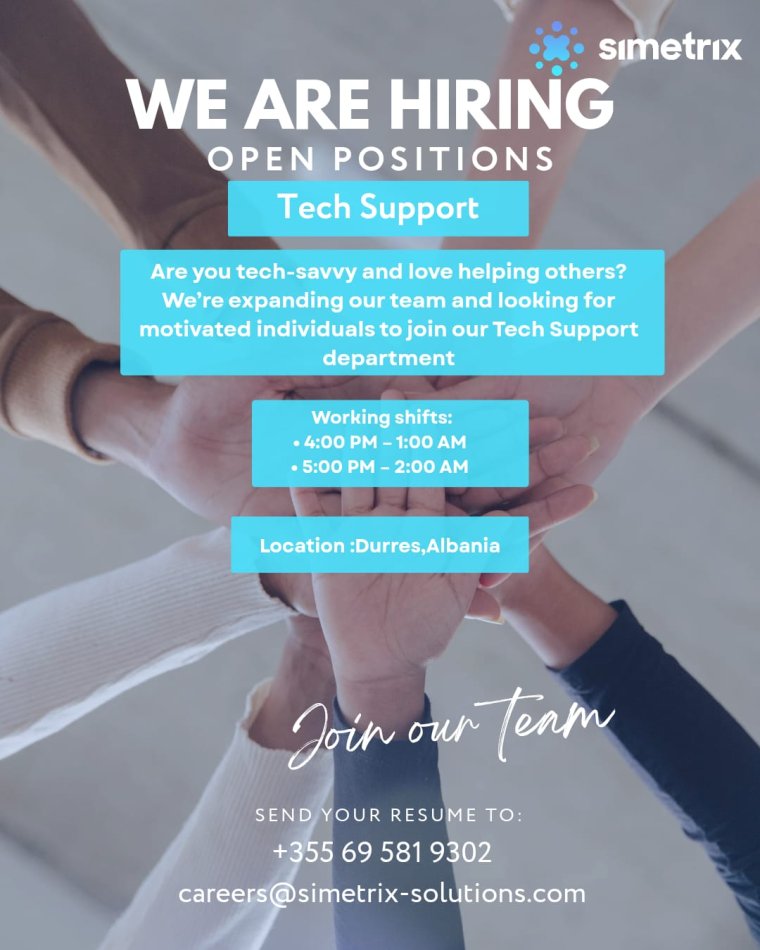 Simetrix Solutions po zgjerohet dhe kĂ«rkon individĂ« energjikĂ«, tĂ« pĂ«rkushtuar dhe me dĂ«shirĂ« pĂ«r tĂ« mĂ«suar, pĂ«r tâu bĂ«rĂ« pjesĂ« e departamentit tonĂ« tĂ« suportit teknik nĂ« DurrĂ«s!