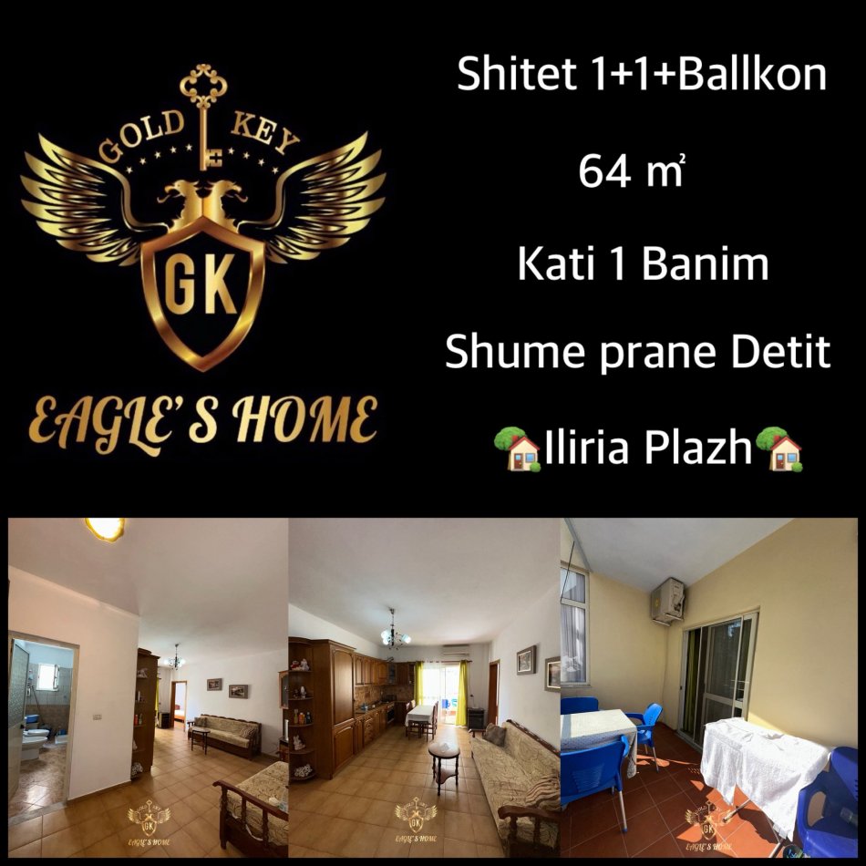 Në zonën e Ilirisë në Plazhin e Durrësit ofrohet për shitje një apartament komod 1+1 me ballkon, i cili ndodhet vetëm pak metra larg detit dhe është pjesë e një pallati të mirëmbajtur me ashensor. Apartamenti përbëhet nga një sallon i bollshëm me kuzhinë të përfshirë, një dhomë gjumi e rehatshme, një tualet me dritare dhe një ballkon të aksesueshëm nga salloni që ofron hapësirë për relaks apo për të shijuar ajrin e freskët bregdetar. Zona është shumë e kërkuar, e qetë dhe e përshtatshme si për banim, ashtu edhe për investim turistik, duke qenë afër plazhit, restoranteve, supermarketeve dhe shërbimeve të ndryshme. Ky apartament është një mundësi e shkëlqyer për pushime familjare apo për gjenerim të të ardhurave përmes platformave si Airbnb apo Booking, falë pozicionit të tij strategjik dhe aksesit të lehtë në zonën më të frekuentuar të Durrësit gjatë sezonit veror.