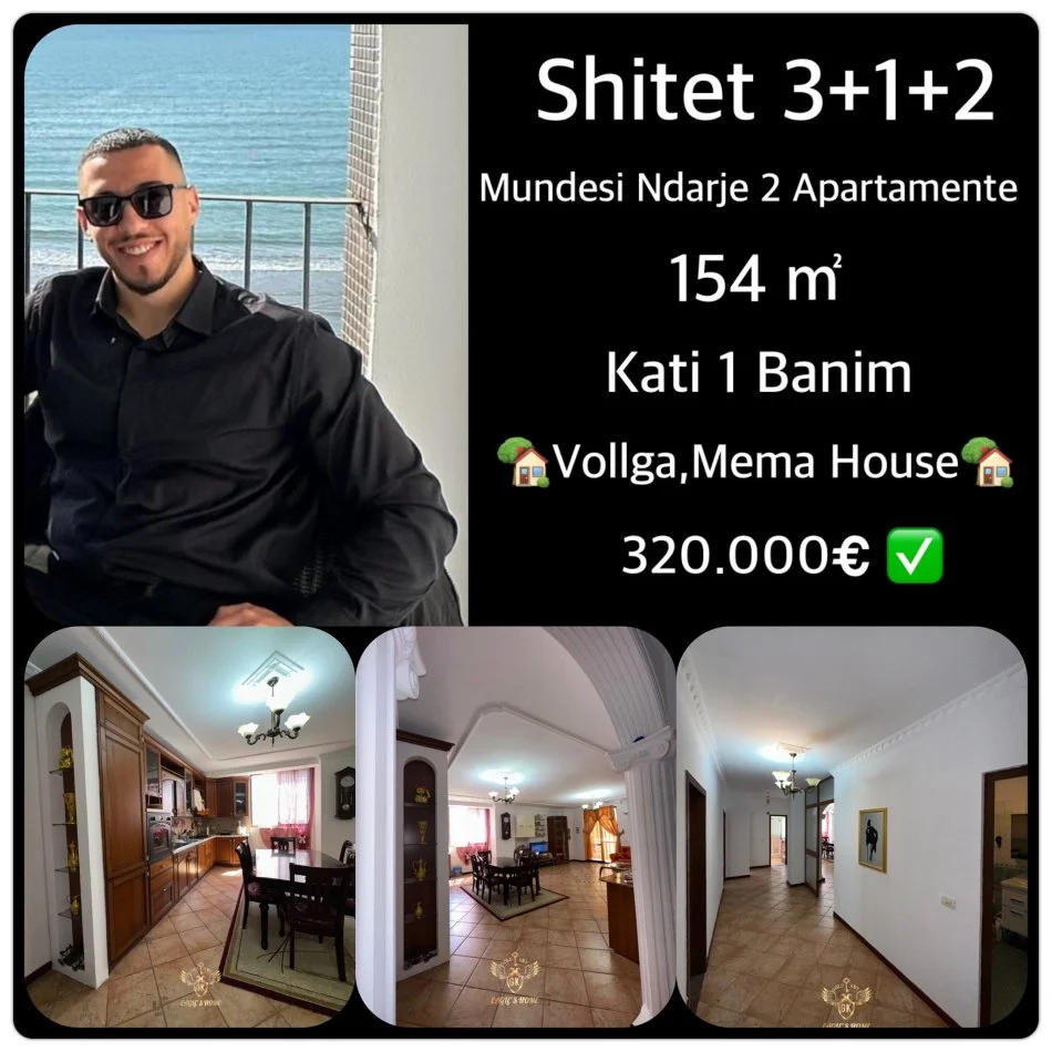 Shitet apartament i gjerë tipologji 3+1+2 me dy ballkone, i pozicionuar në katin e parë të banimit (të dytin nga toka), me sipërfaqe totale prej 154 m² dhe orientim jug-lindje, që ofron dritë natyrale gjatë gjithë ditës dhe pamje nga deti. Ambienti kryesor përfshin kuzhinën dhe dhomën e ndenjjes në koncept open space me dalje direkte në ballkon, duke krijuar një hapësirë të ndritshme dhe mikpritëse. Apartamenti ka korridor të bollshëm, ndërsa një nga tualetet është me ajrosje natyrale, duke shtuar komoditetin e përdorimit. Ka mundësi ndarjeje në dy apartamente të veçanta, duke e bërë një zgjedhje perfekte si për banim familjar ashtu edhe për investim fitimprurës me qira.