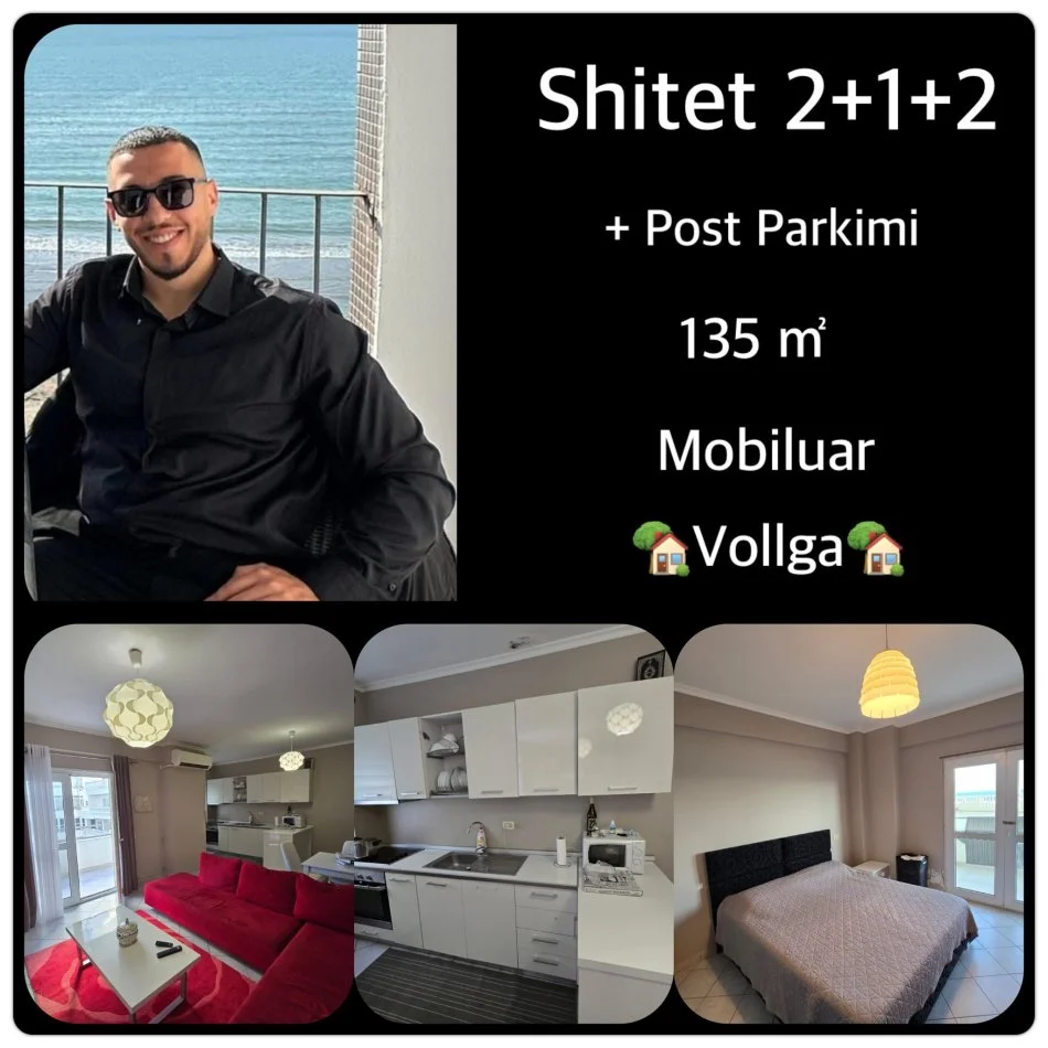Shitet apartament i mobiluar 2+1+2 me POST PARKIMI në një nga zonat më të preferuara të Durrësit, në Vollga, shumë pranë shëtitores dhe vetëm pak hapa nga deti. Apartamenti ka një sipërfaqe totale prej 135 m² dhe ndodhet në katin e tretë të një ndërtese të re me ashensor. Orientimi jug-lindje ofron ndriçim natyral gjatë gjithë ditës dhe ajrosje të shkëlqyer. Ambienti është i organizuar në një sallon të madh ndenjeje me kuzhinë ne nje hapsire, dy dhoma gjumi të bollshme, dy tualete dhe dy ballkone me pamje të hapur. Apartamenti shitet i mobiluar , gati për të banuar . Në çmim përfshihet edhe një post parkimi i dedikuar. Një mundësi ideale për banim familjar ose investim në një zonë elitare dhe të qetë.