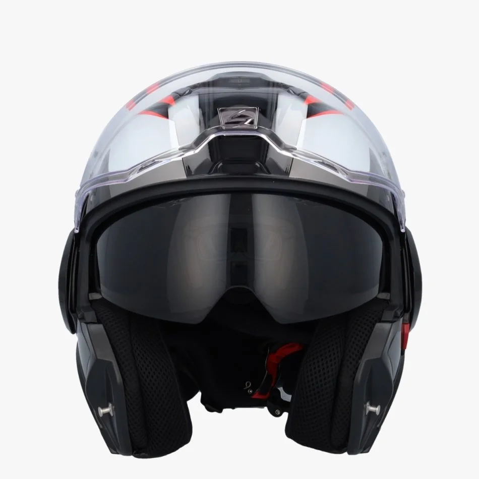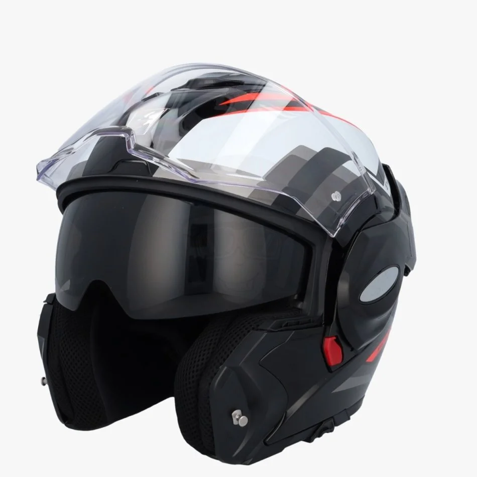 Ndryshe nga helmetat e tjera modulare, xhami kryesor qëndron poshtë kur pjesa e mjekrës është e palosur, duke siguruar mbrojtje të vazhdueshme nga insektet dhe mbeturinat.