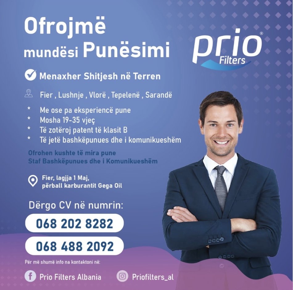 Prio Filters Albania, kompani lider në shitjen e filtrave të ujit, është në kërkim të Menaxherëve të Shitjeve në Terren.