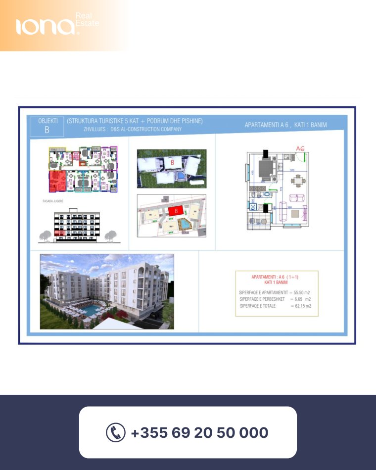 Tipologji: 1+1 Sipërfaqe neto: 55.50 m² Sipërfaqe e përbashkët: 6.65 m² Sipërfaqe totale: 62.15 m² Kati: 1 banim Arredim: I pamobiluar (në ndërtim) Orientim: Jug-Perëndim Vendndodhje: Kompleks i mirëorganizuar me pishinë Certifikatë pronësie: Në përfundim të ndërtimit
