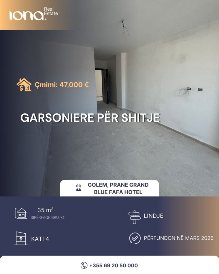 Një mundësi ideale investimi ose banimi në një nga zonat më të kërkuara të Golemit. Garsonierja ndodhet pranë hotel Grand Blue Fafa, në ndërtim të ri që përfundon në mars 2026, me orientim lindor që garanton dritë natyrale gjatë ditës. Lokacioni: Golem, pranë Grand Blue Fafa Hotel Kati: 4 banim Sipërfaqe bruto: 35 m² Orientim: Lindje Statusi: Ndërtim i ri – përfundon në Mars 2026 Çmimi: 47,000 € Kontakto për më shumë informacion: +355 69 20 50 000