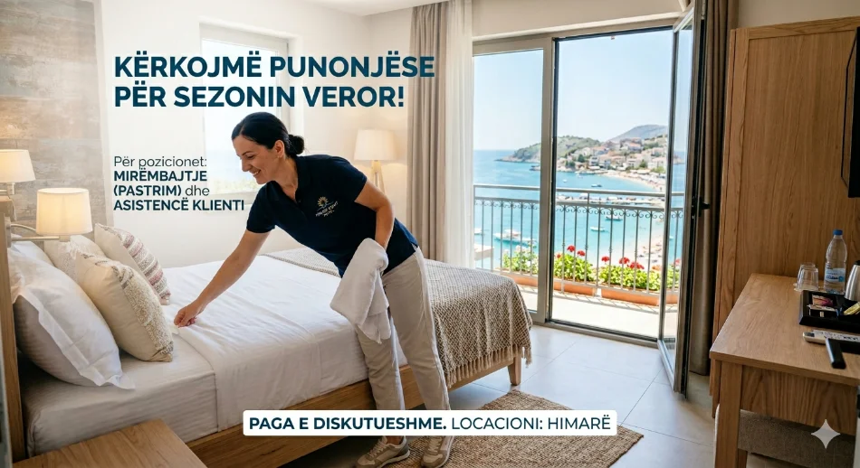Kërkojmë një punonjëse korrekte dhe bashkëpunuese për sezonin veror në Himarë. Pozicioni përfshin mirëmbajtjen e dhomave (pastrimin) dhe asistencën në shërbimin ndaj klientit.