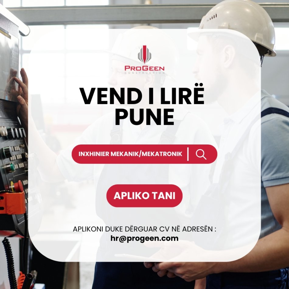 Po kërkojmë një Inxhinier Mekanik/Mekatronik të apasionuar për mekanikën, inovator dhe me njohuri në makineritë e prodhimit me kontroll numerik. Kandidati duhet të ketë eksperiencë dhe dëshirë për të mësuar/eksperimentuar në fushën e tij. Përgjegjësitë kryesore do të jenë, projektimi dhe zbatimi i elementëve metalik për projektet tona të ndërtimit dhe elementeve te reja në ndërtim. Po ashtu do të drejtojë dhe ndjekë punën në Repartin Mekanik të shoqërisë. Kandidati do të jetë pjesë e grupit të projektimit, planifikimit dhe prodhimit.