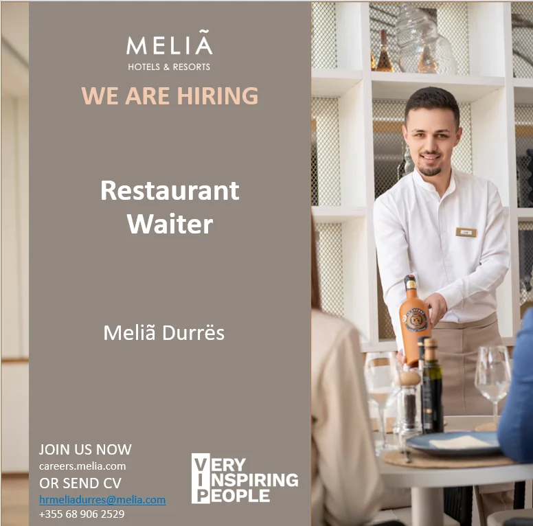 Meliá Durrës Albania është në kërkim të Kamarierëve/eve të Restorantit, të motivuar dhe të orientuar drejt shërbimit cilësor, për t’iu bashkuar ekipit tonë profesional në industrinë e mikpritjes.