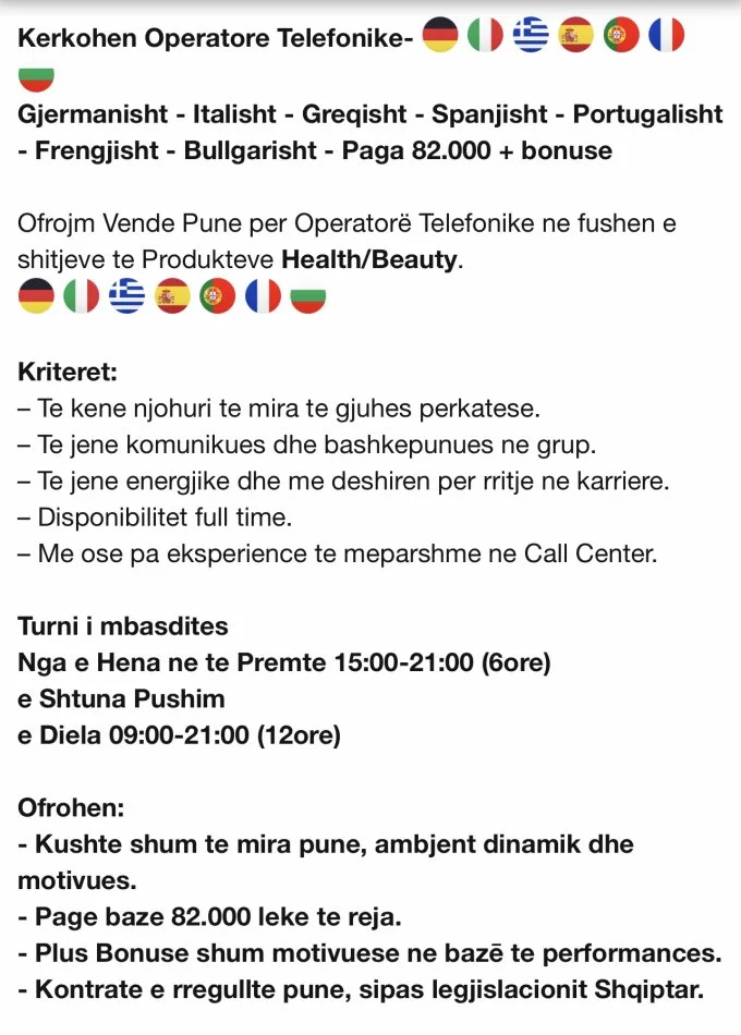 Kerkohen Operatore Telefonike - Germanisht - Italisht - Greqisht - Spanjisht - Portugalisht - Frengjisht - Bullgarisht || Paga 80.000 + bonuse 70.000 leke e siper (Prane 21 Dhjetorit) CALL CENTER I LIGJSHEM.