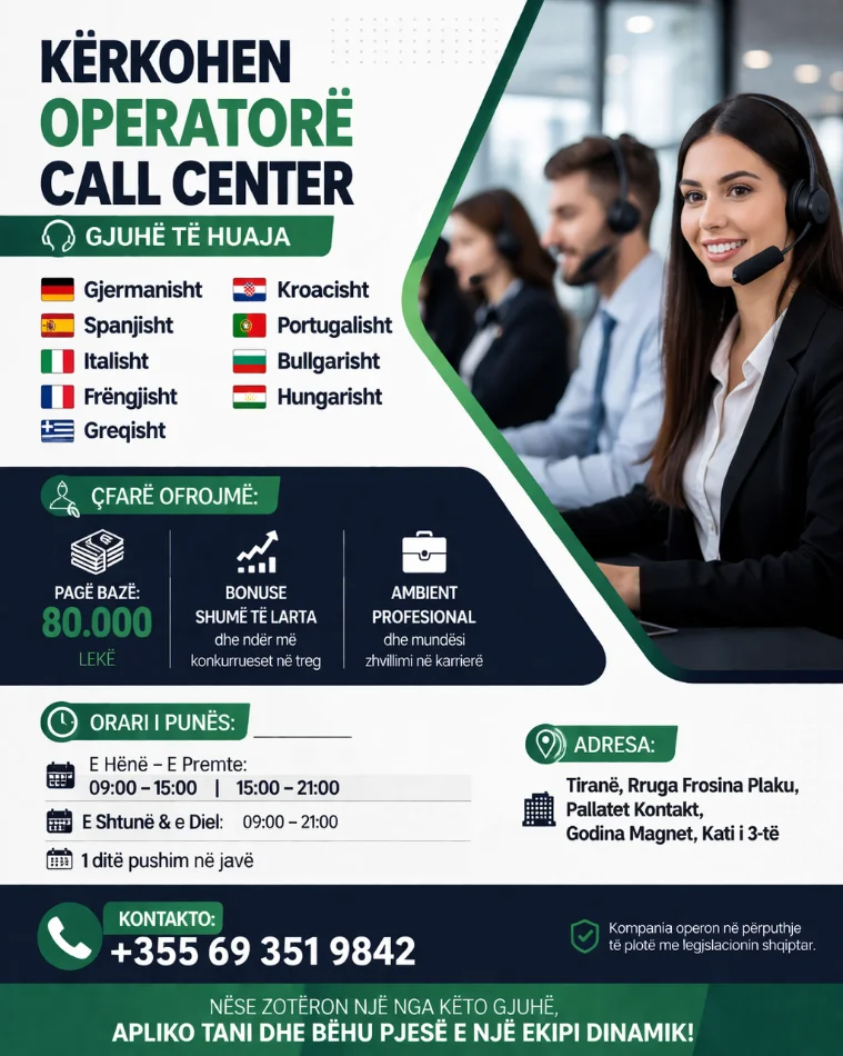 Kerkojme agjent telefonik ne gjuhet: Gjermane 🇩🇪 | Spanjolle 🇪🇸 | Italiane 🇮🇹 | Portugeze 🇵🇹 | Bullgare 🇧🇬 | Polake | 🇵🇱 Franceze 🇫🇷