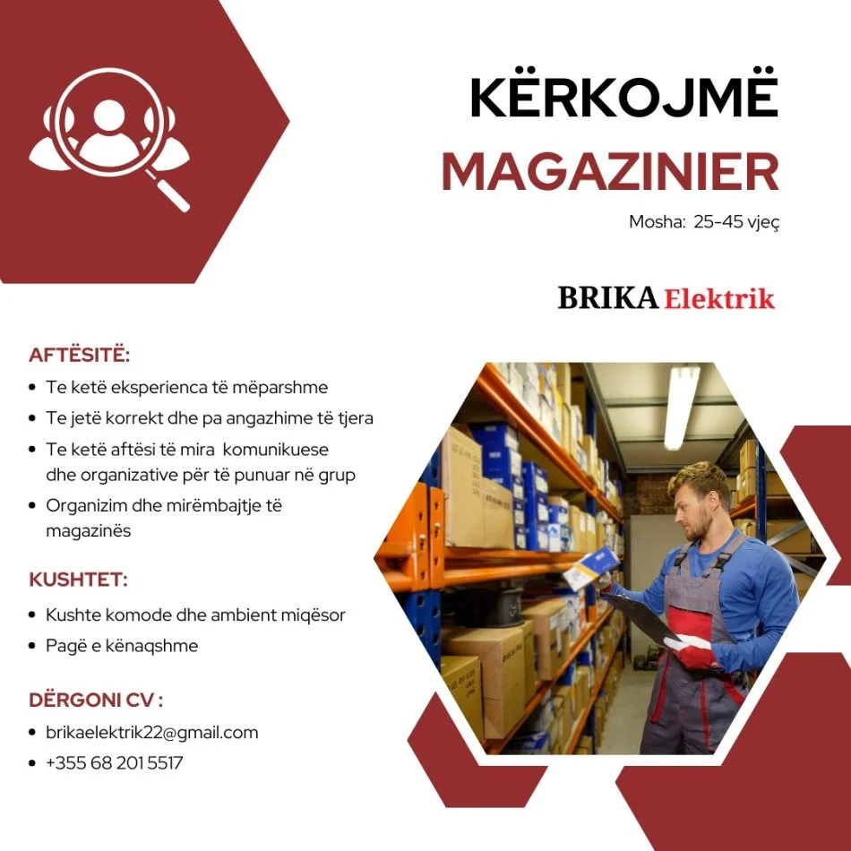 • Kompania BRIKA ELEKTRIK po kërkon të zgjerojë stafin e saj në pozicionin Magazinier