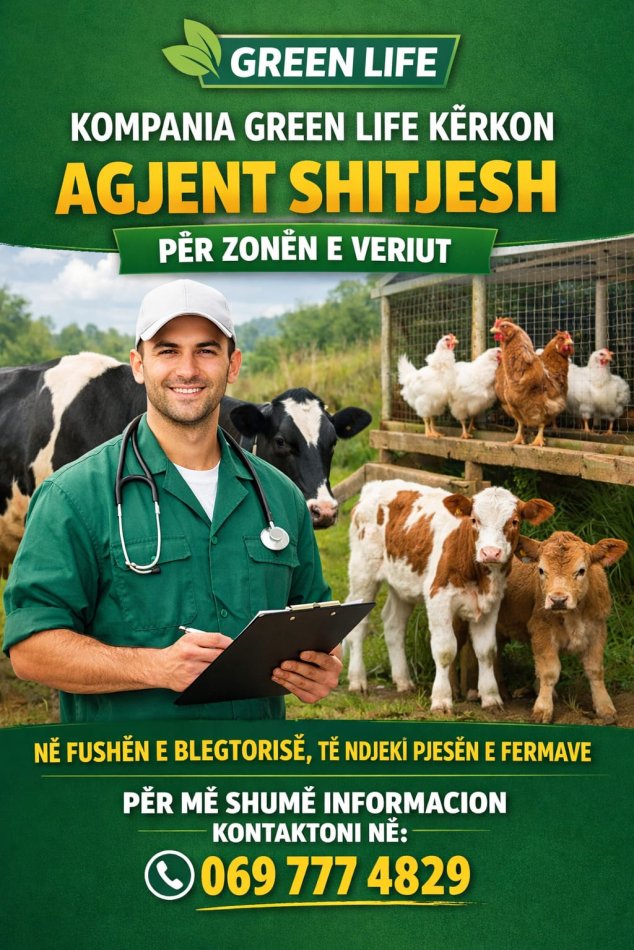 Kompania Green Life Company kerkon agjent shitjesh ne terren ne zonat Lezhe, Shkoder, Fushe-Kruje, ne shitjen e produkteve blegtorale.