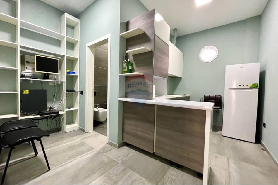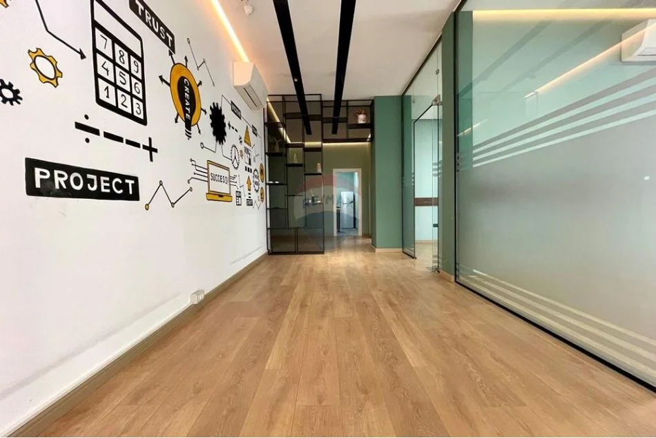 - Ka nje siperfaqe neto prej 260m2, e ndare ne disa ambiente, 3 dhoma te dedikuara pune, nje kuzhine e vecuar, nje tualet, nje dhome teknike, korridori qe ben shperndarjen e ambienteve, veranda e cila aksesohet nga te gjitha dhomat si dhe garazhdi i mbyllur me mundesi shfrytezmi per ambiente te tjera pune ose parkim per 6-7 makina.