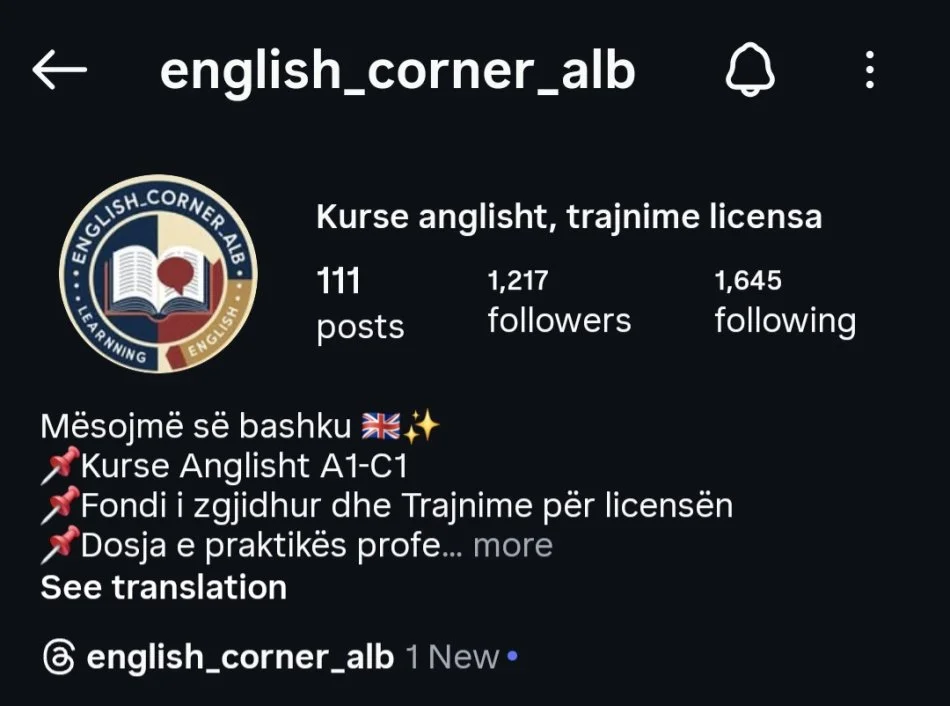 Ofrojme Kurse anglisht A1-C1, Fondin e zgjidhur dhe Trajnime per Licensen per Gjuhen Angleze, Dosjen e Praktikes Profesionale. Kontakt -> Cel : 0684320865 ose Instagram : english_corner_alb