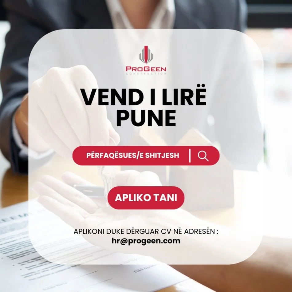 Përmbledhja e rolit: Progeen kërkon një Përfaqësues Shitjesh të talentuar dhe të motivuar për të menaxhuar dhe ndjekur procesin e shitjes së apartamenteve dhe pasurive të tjera të paluajtshme. Roli përfshin angazhimin aktiv në ndërtimin e marrëdhënieve me klientët, analizimin e tregut dhe garantimin e përmbushjes së objektivave të kompanisë.