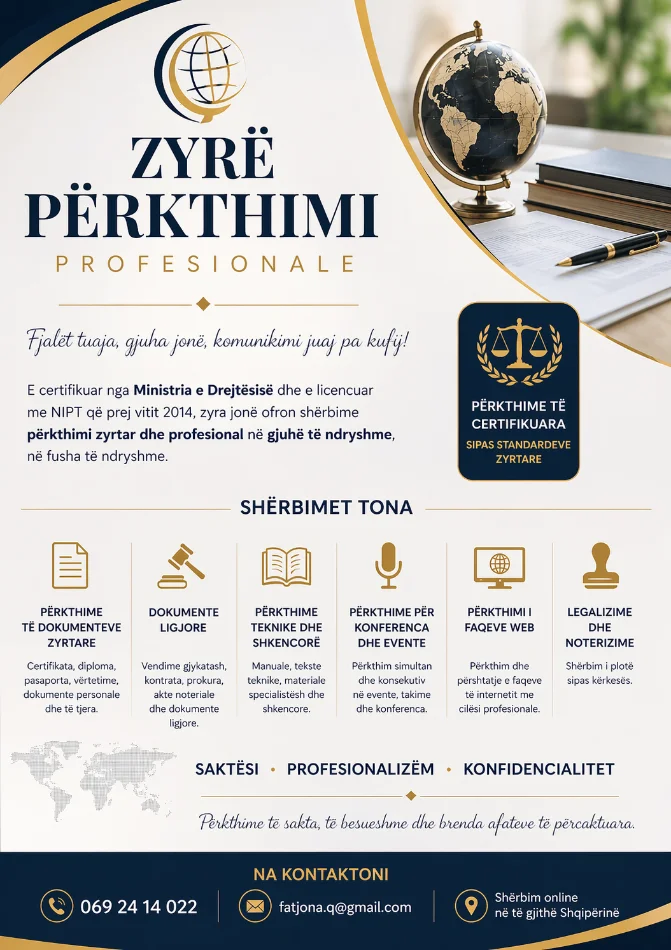 • Përkthime të dokumenteve zyrtare (certifikata, diploma, pasaporta, vërtetime, etj.)