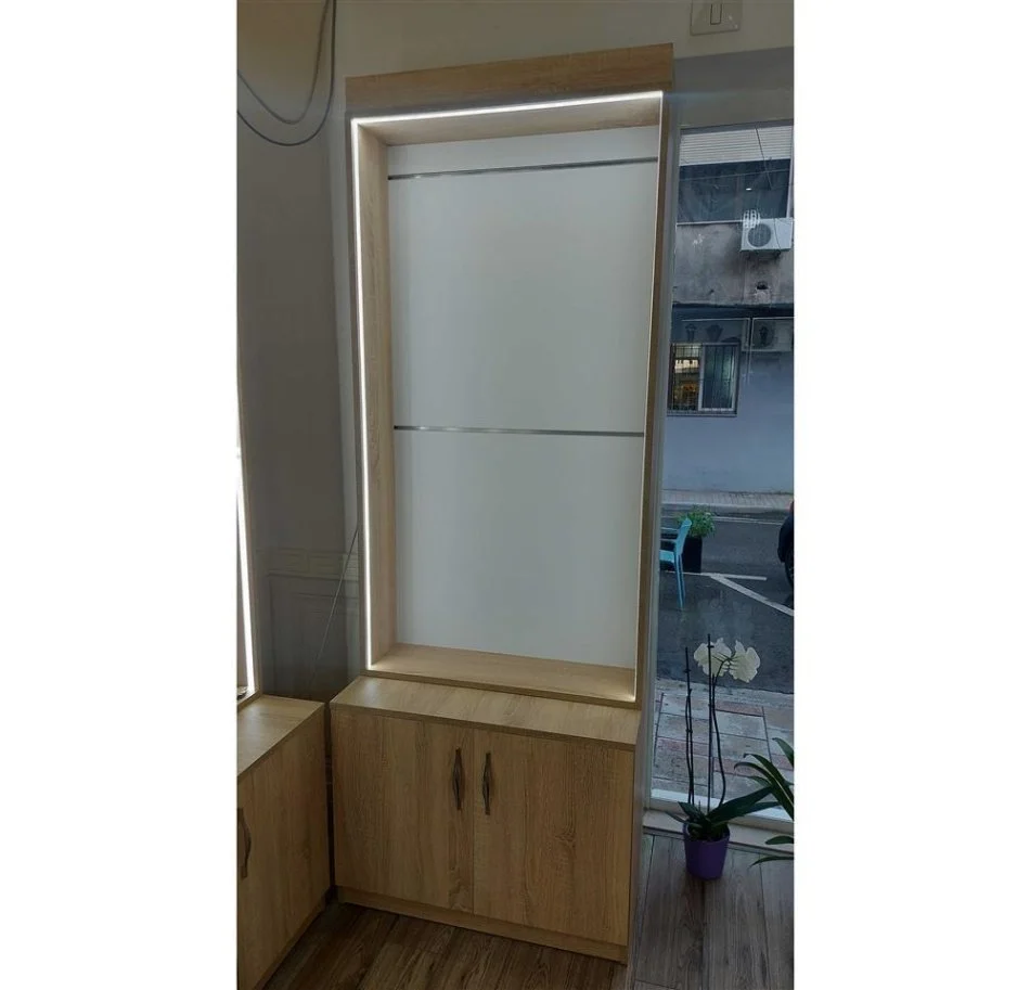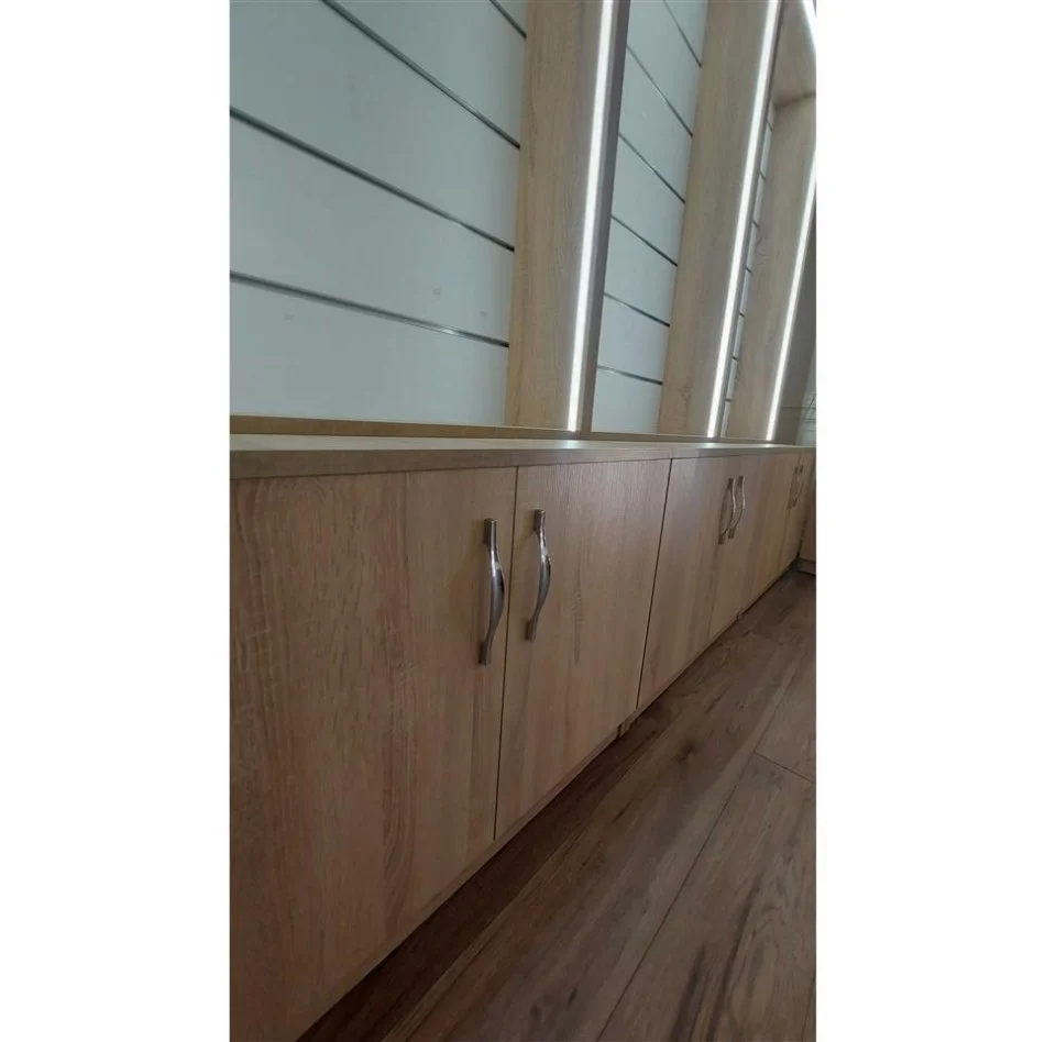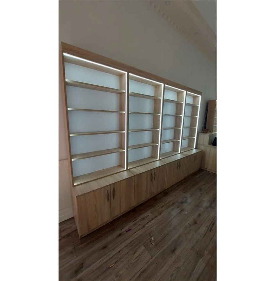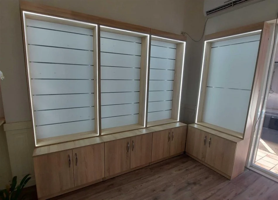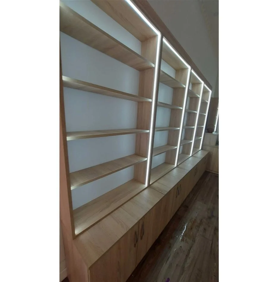 Rafte melamin Sonoma për dyqane, kanceleri, bibliotekë etj. Në gjendje të re me ndriçim LED rreth e rrotull.