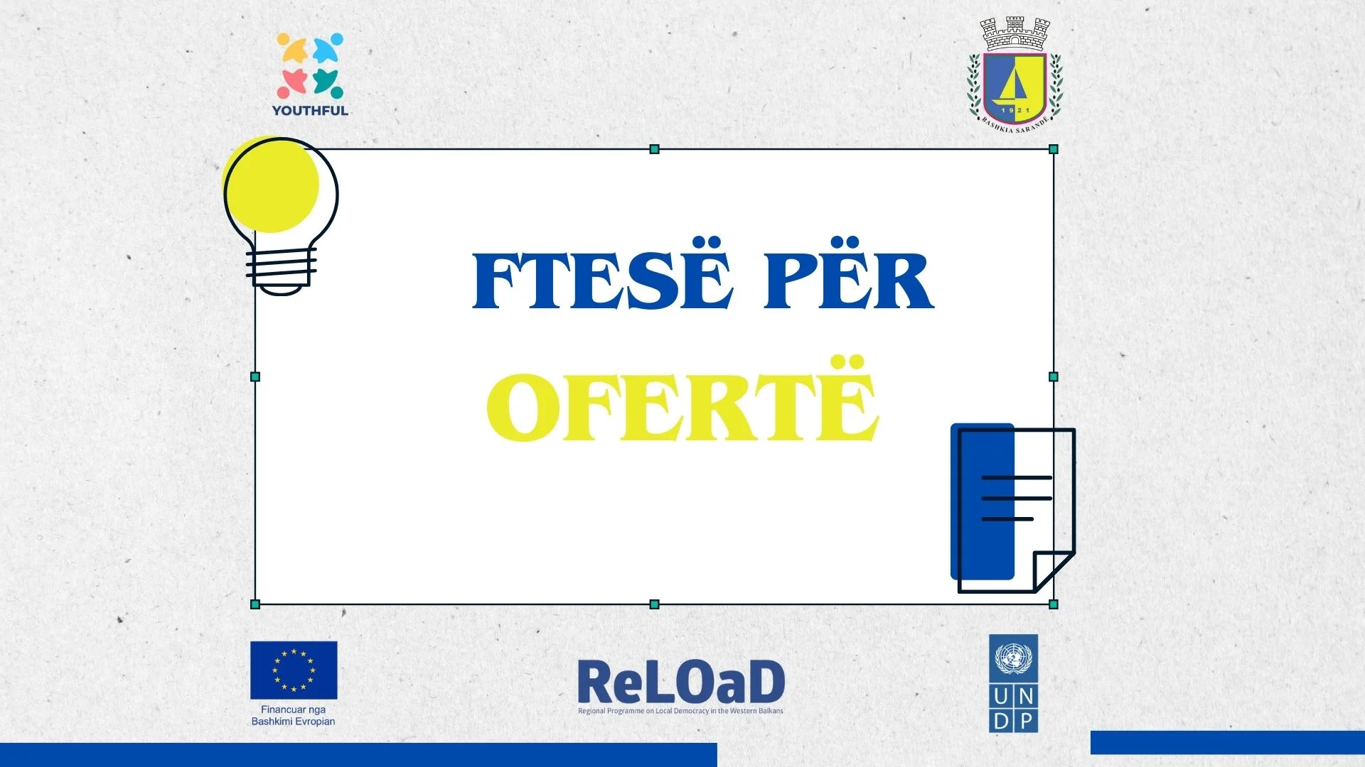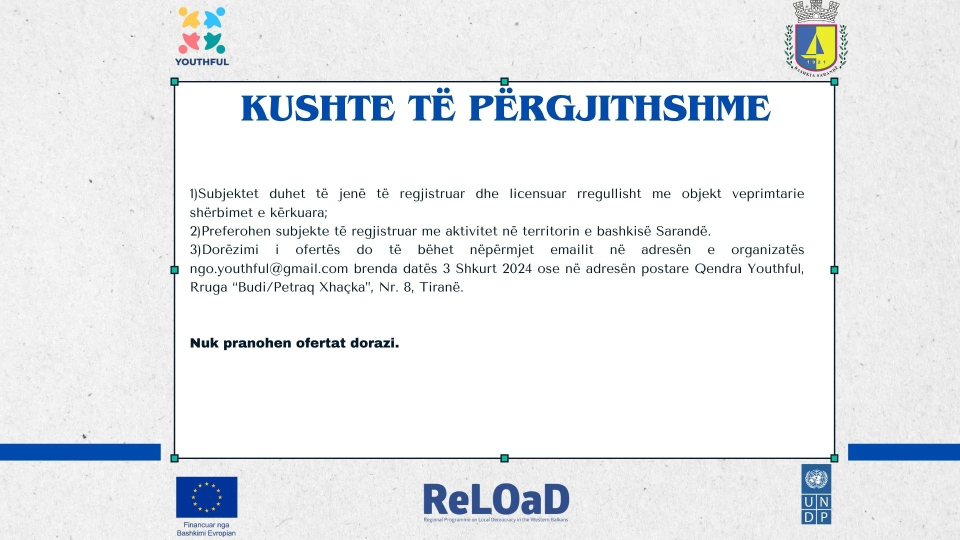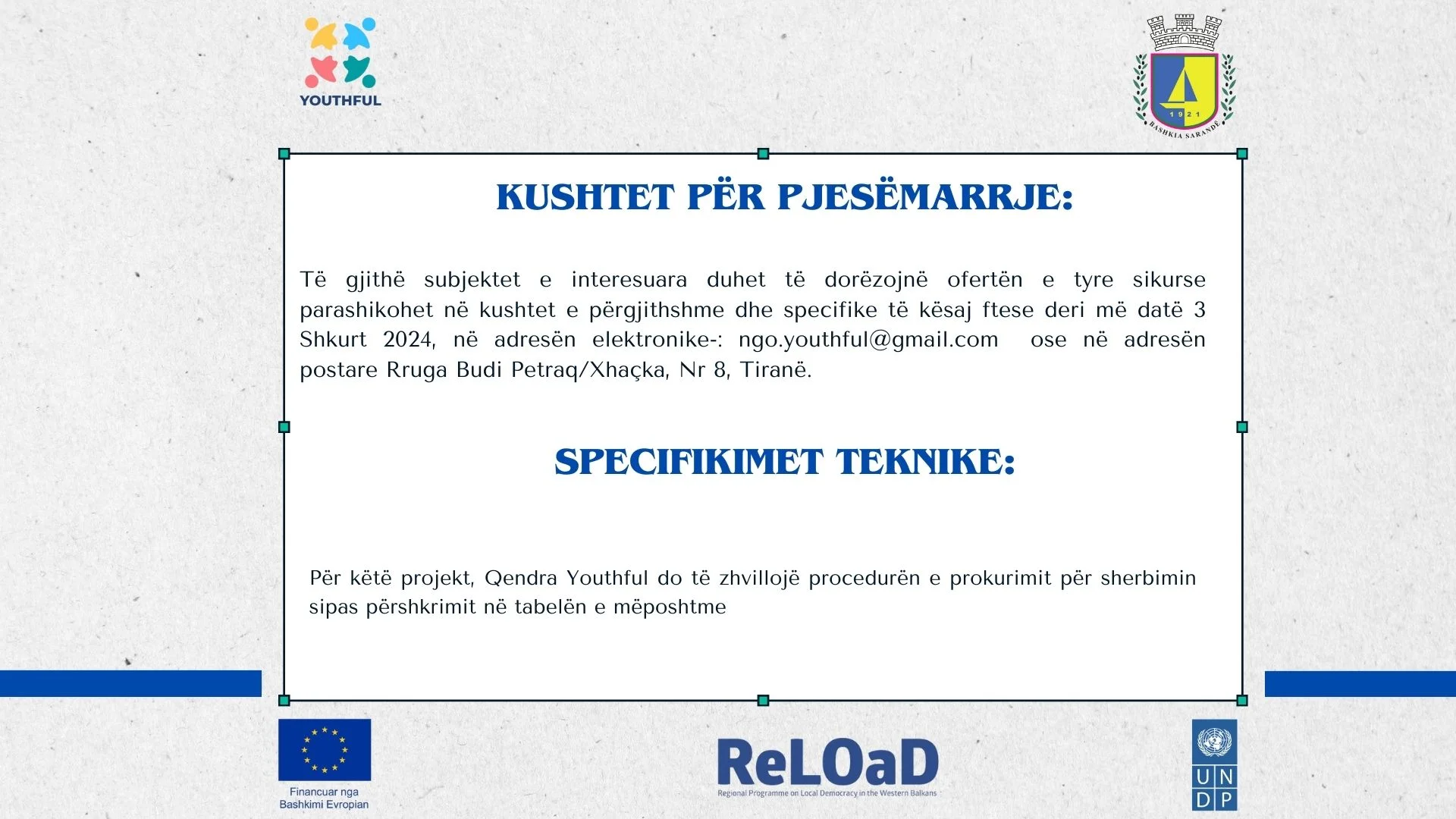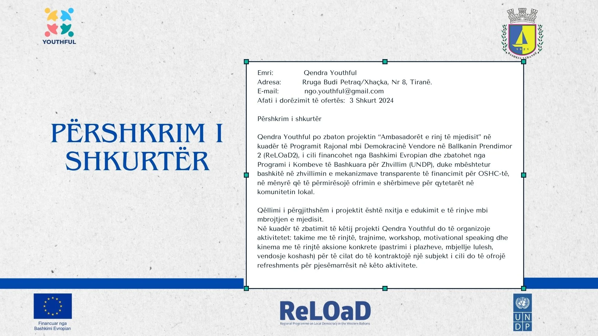 Qendra Youthful në kuadër të projektit “Ambasadorët e rinj të mjedisit:”, pjesë e Programit Rajonal mbi Demokracinë Vendore në Ballkanin Prendimor 2 (ReLOaD2), i cili financohet nga Bashkimi Evropian dhe zbatohet nga #UNDP, shpall