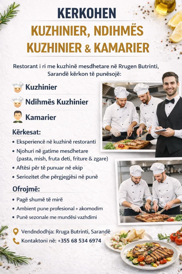 Kërkohen Kuzhinier, Ndihmës Kuzhinier dhe Kamarier – Sarandë