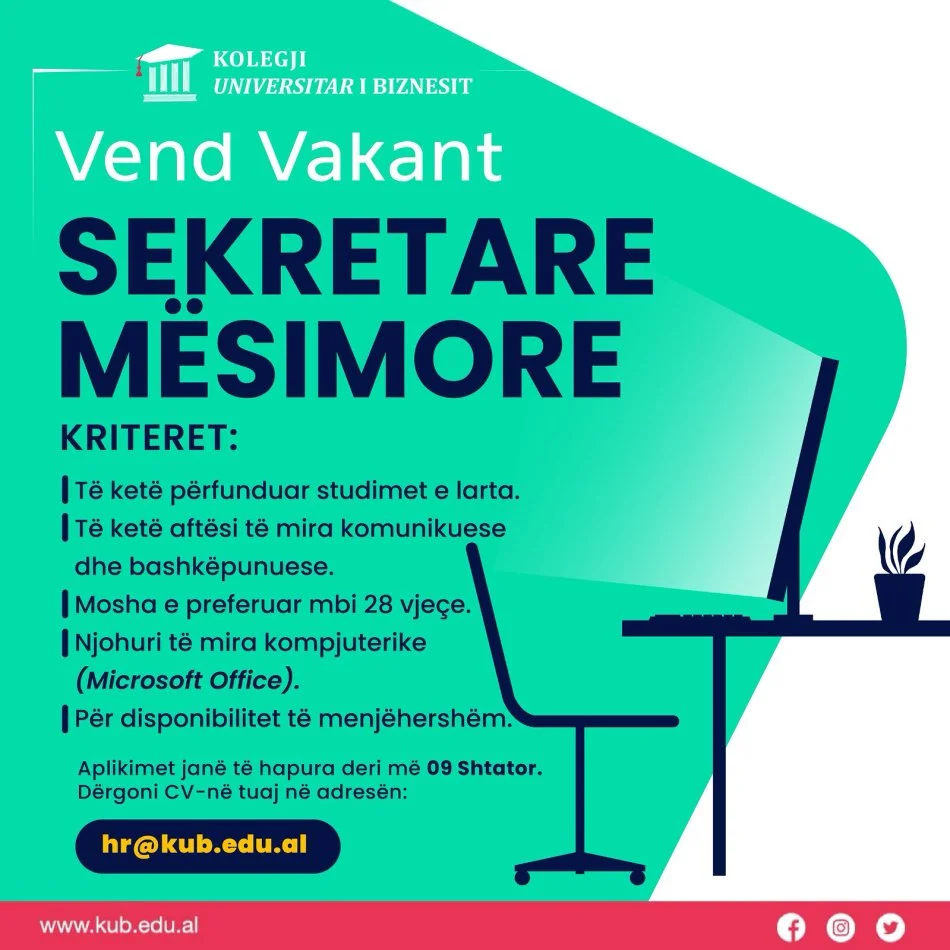 Kolegji Universitar i Biznesit shpall pozicion vakant për Sekretari Mësimore me kohë të plotë.