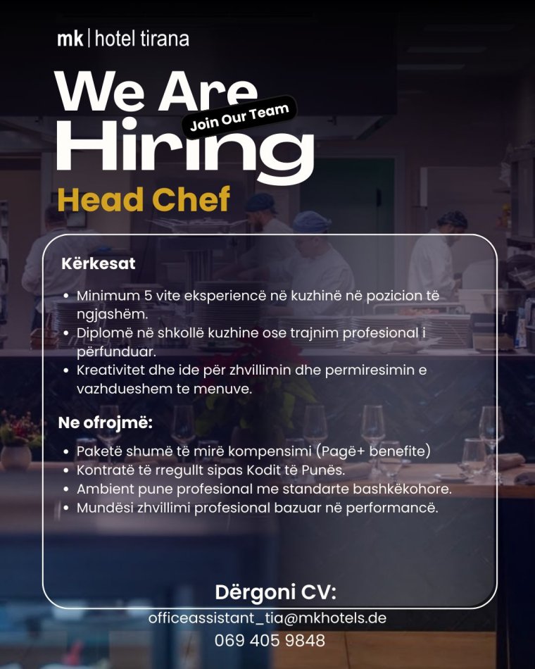 MK Hotel Tirana kërkon të punësojë një Shef Kuzhine, i cili do të udhëheqë ekipin e kuzhinës dhe do të sigurojë standard të lartë cilësie, organizimi, higjiene dhe menaxhimi korrekt të kostove.
