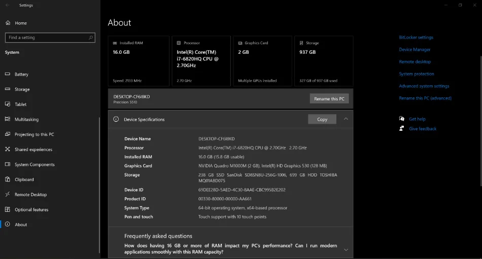 Shes Dell Precision 5510– i7, 16GB RAM, 256GB SSD, 4K Touch