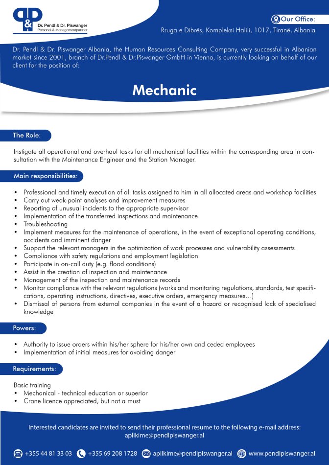 Dr. Pendl & Dr. Piswanger Albania & Kosovo is currently looking on behalf of our client for the position of Mechanic.