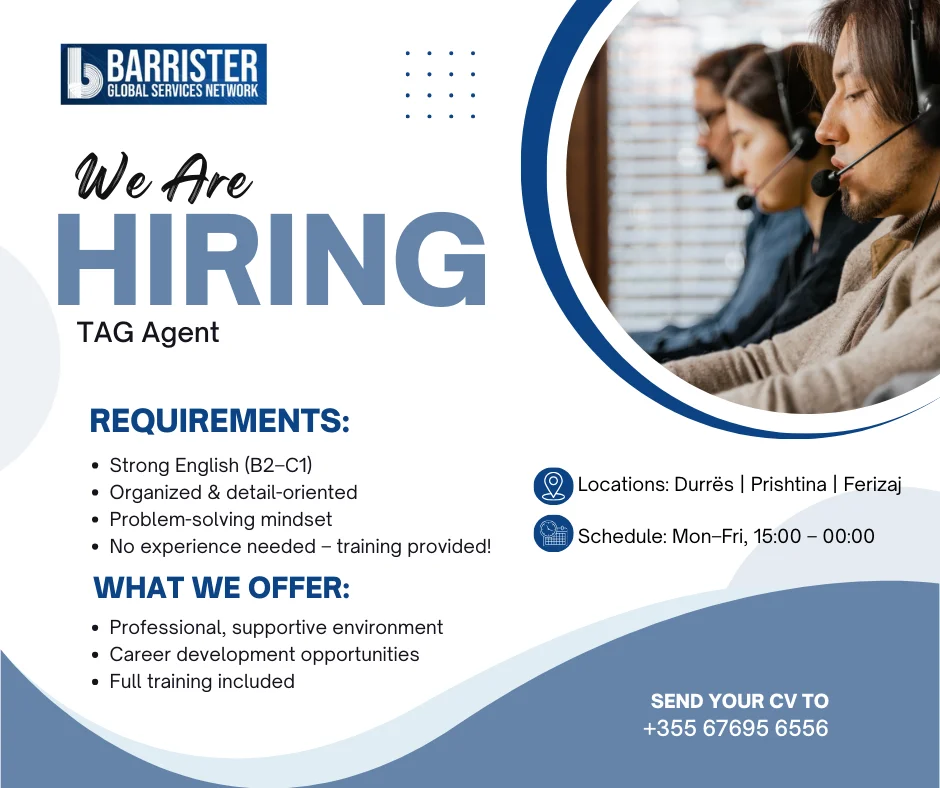 #Hiring #CareerOpportunity #TAGAgent #TechSupport #DurresJobs #JoinOurTeam #BarristerCareers
