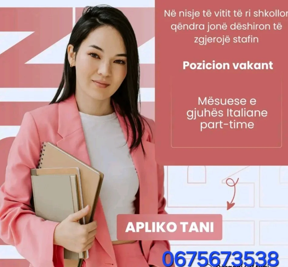 16.09.2025, 17:32 centerlindi19 Tiranë, Italisht mësuese part time Durres Nr. Njesia - Zona me e afert? 8 Concord Center | 5 Maji | Ferit Xhajko Tipi part time Fusha | Profili i punes Mesimdhenie | Pedagogji Gjuha italisht Kërkohet zyshë për gjuhën Italiane.Me ose pa eksperiencë. Cel. : 0675673538 Apply WhatsApp