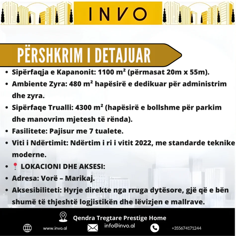 • Aksesibiliteti: Hyrje direkte nga rruga dytësore, duke lehtësuar proceset logjistike.