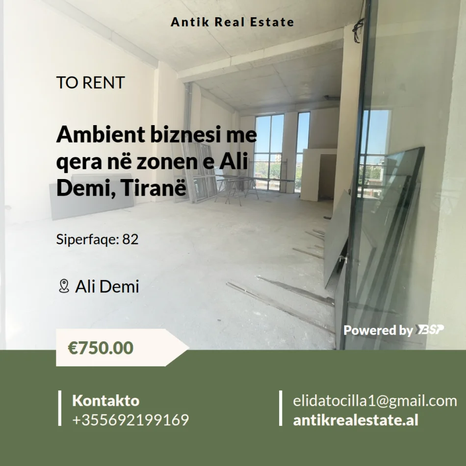 Ambient biznesi për qera ndodhet në zonën e Ali Demit në Tiranë dhe ofron një hapësirë prej 82 m².