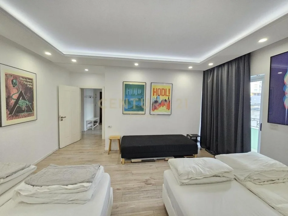 Apartamenti ka siperfaqe 180 m2 dhe eshte i organizuar ne nje ambjent open space dhe 1 tualet .