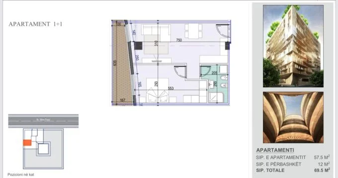 Me siperfaqe 69.5 m2 bruto, 57.5 m2 neto.