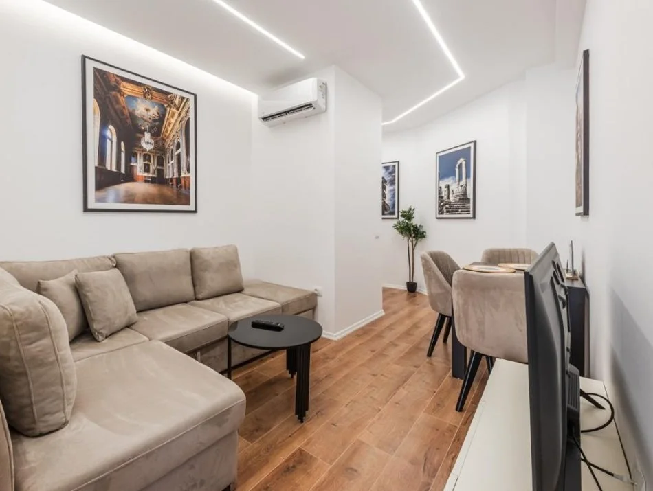 Apartamenti është i organizuar në 1 dhomë gjumi + sallon me kuzhinë, i përshtatshëm për çift ose individë.