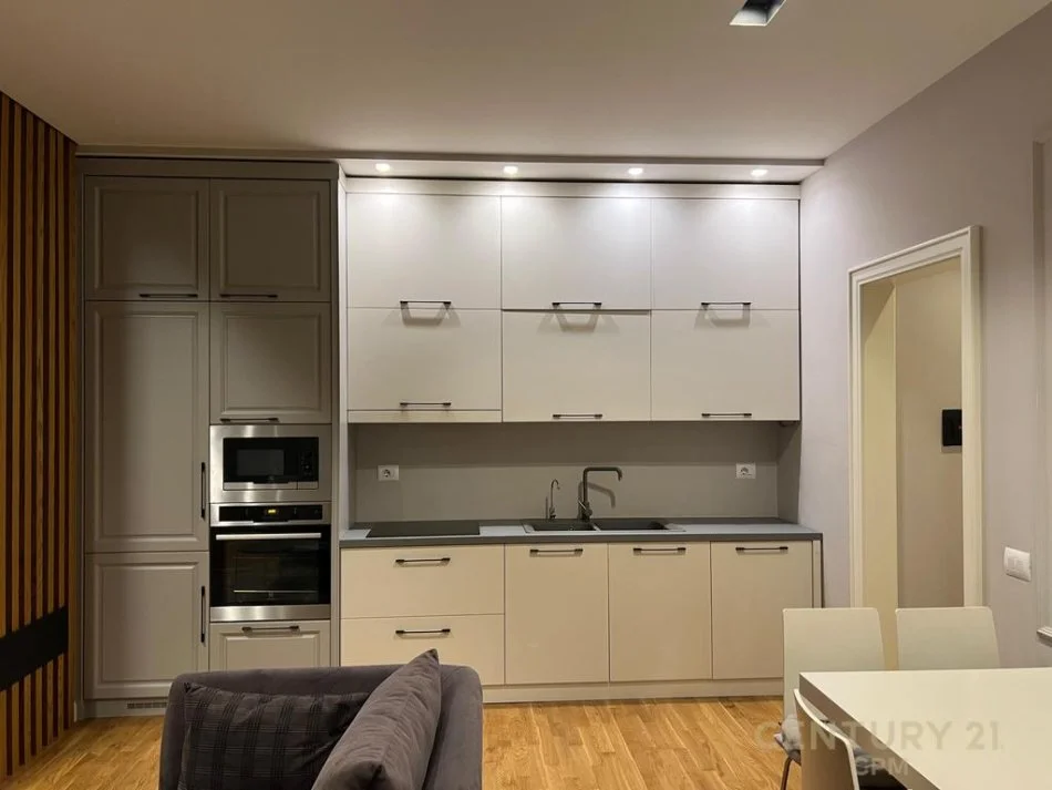Apartamenti ndodhet ne katin e pare te nje pallat te ri 6 katesh, i cili organizohet nga nje sallon ndenje, nje dhome gjumi, nje tualet,dhe 1 ballkon. Mobilimi i apartamentit eshte modern dhe i investuar ne detaje.