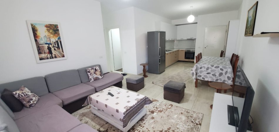 Apartamenti është i mobiluar në mënyrë moderne dhe bashkëkohore, duke ofruar një ambient funksional dhe plot stil për një jetë të rehatshme.
