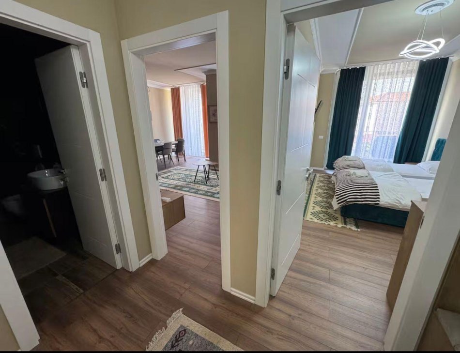 Apartamenti disponon 2 dhoma gjumi 2 banjo,me sallon dhe kuzhine te veçuar. Pallati eshte i vitit 2025,i mobiluar ne menyre bashkohore