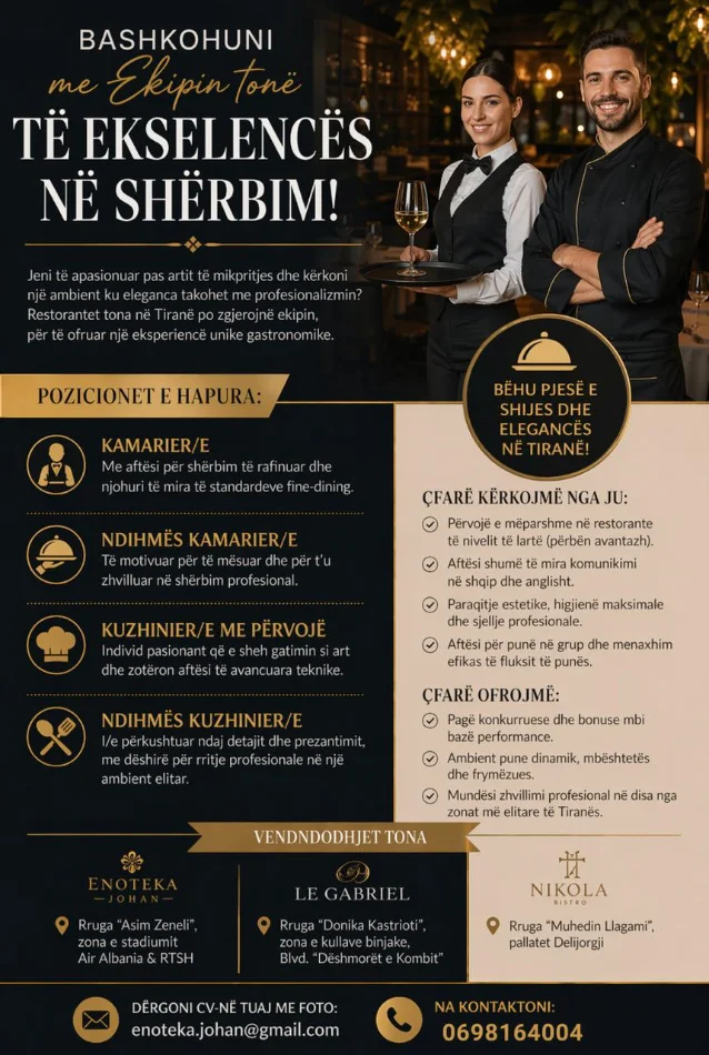 - Kuzhinier/e me përvojë: Kërkojmë një individ pasionant, që e konsideron gatimin art dhe zotëron aftësi të larta teknike për të ofruar një eksperiencë kulinare të paharrueshme për klientët tanë.