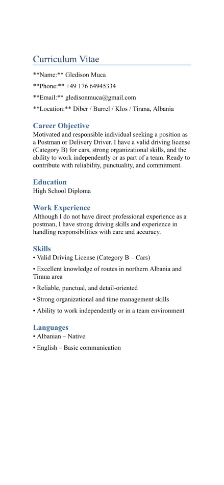 Tirane, kërkoj vend pune me orar te plote | turni II Shofer