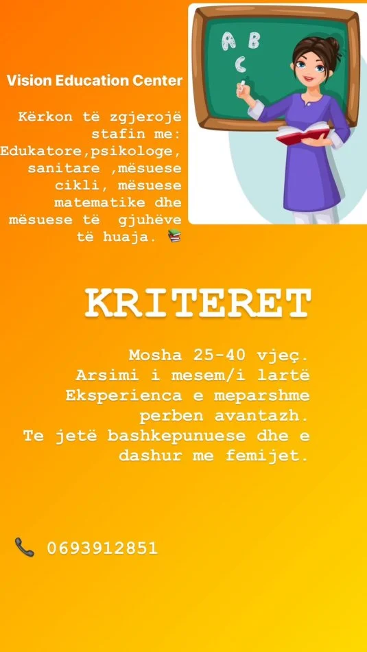 VISION EDUCATION CENTER kerkon te zgjeroje sfatin me: edukatore, psikologe, sanitare, mesuese cikli, mesuese matematike dhe mesuese te gjuheve te huaja.