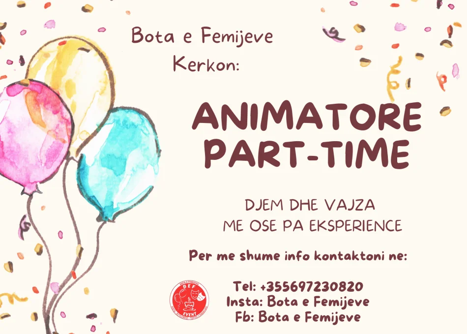 Agjensia e ditelindjeve "Bota e femijeve" kerkon te punesoje part-time si animatore djem dhe vajza me ose pa eksperience, kryesisht per pjesen e paradites.
