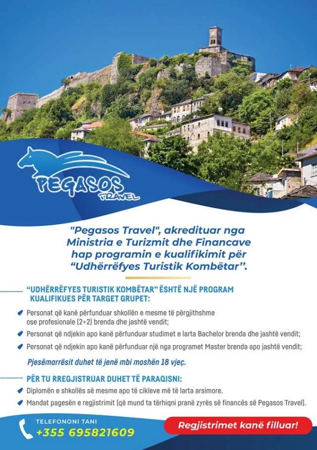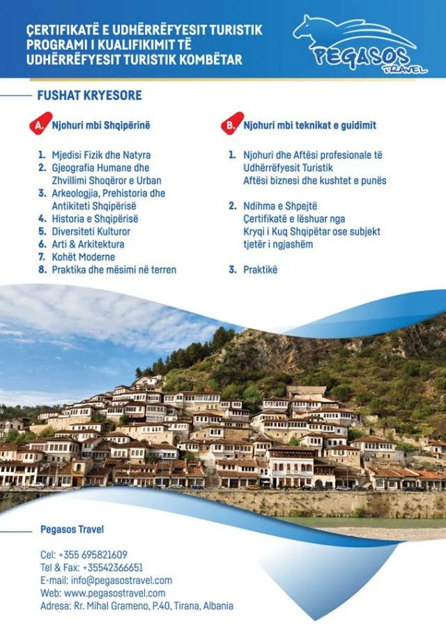 [h=2]Tirane, kurse Formimi profesional Turizem Udherrefyes Turistik , kurs i akredituar[/h]Ju njoftojmë se në datën 1 Shkurt Pegasos Travel e Akredituar nga Ministria e Turizmit dhe Financave do të fillojë kursin e kualifikimit për
