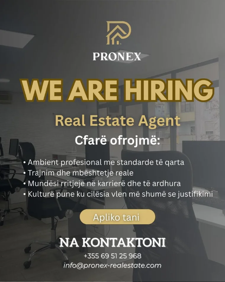 Nëse je një person ambicioz, energjik, dhe të pëlqen fusha e shitjeve, Pronex Real Estate, është mundësia ideale!