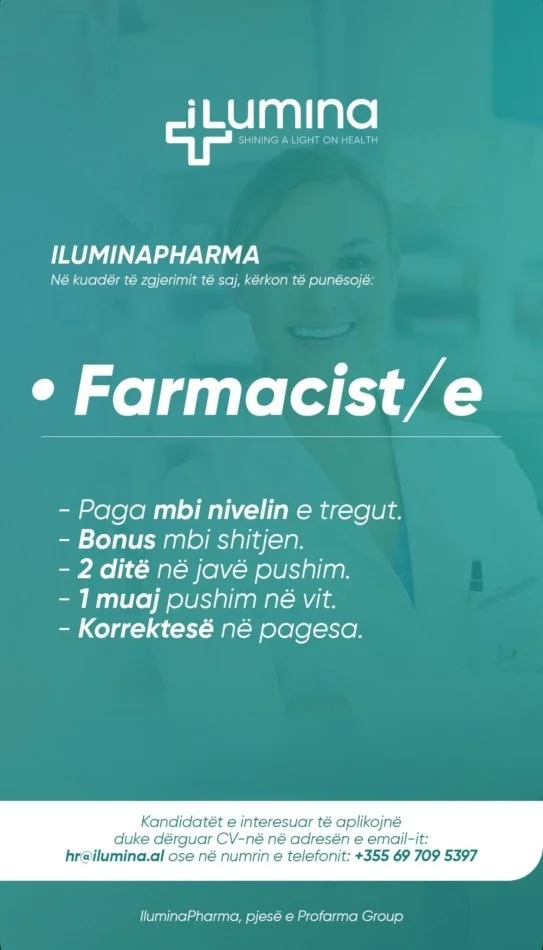 IluminaPharma, pjesë e Profarma Group, në kuadër të zgjerimit të saj, kërkon të punësojë Farmacist/e për farmacitë e saj në Tiranë