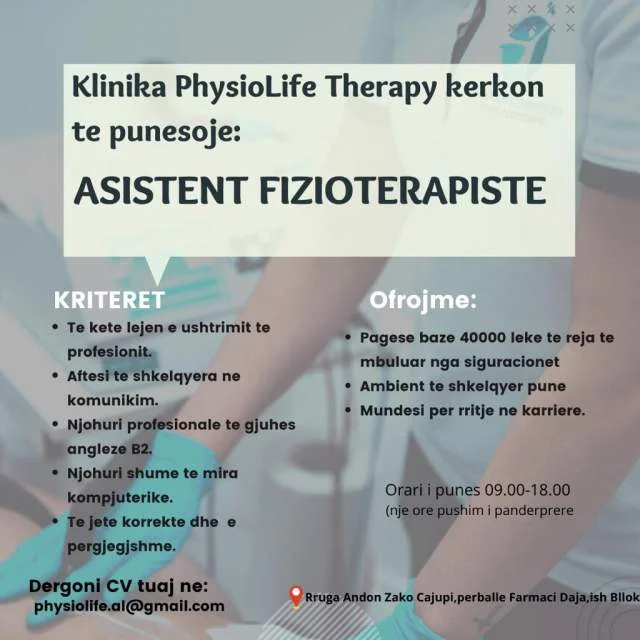 Klinika PhysioLife Therapy,klinike fizioterapie me eksperience shumvjecare ne trajtimin e patologjive neurologjike,ortopedike,pediatrike kerkon te punesoje asistent fizioterapiste (F) me orar te plote.