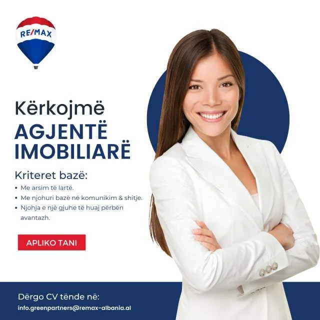 Apliko duke dërguar CV tënde në: info.greenpartners@remax-albania.al.